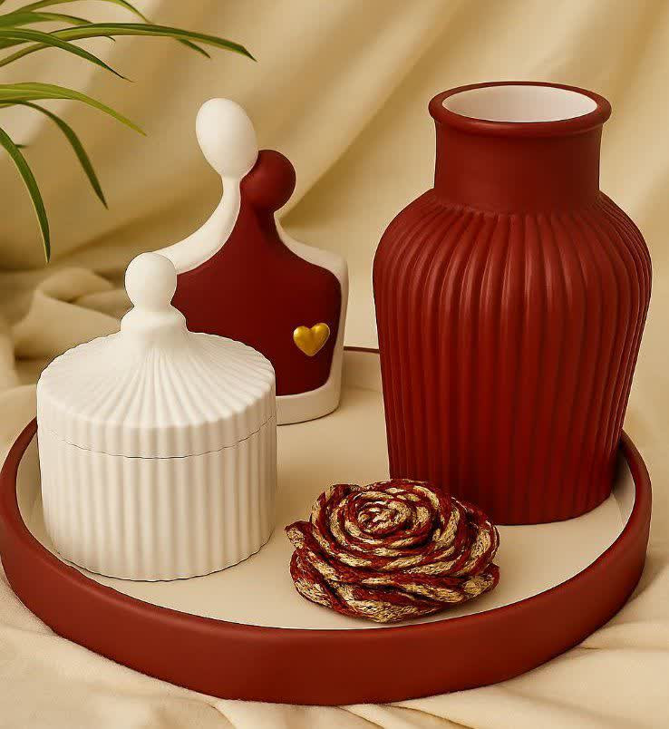 - 🧺 اقلام موجود: گلدان دکوری، ظرف دربدار، مجسمه قلبدار، سینی پایهدار