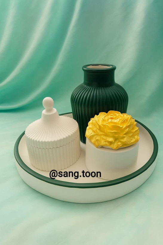 ست رومیزی شامل گلدان مراکشی بزرگ 14سانتی متر و جاعودی پایه دار و قندان و سینی است که از جنس نانو پلیمر است و اگر می خواهید رنگ آن عوض شود در توضیحات بنویسید و این ست چها ر تیکه هرکدام هم به تنهایی در مکانهای دیگه خانه استفاده می شود